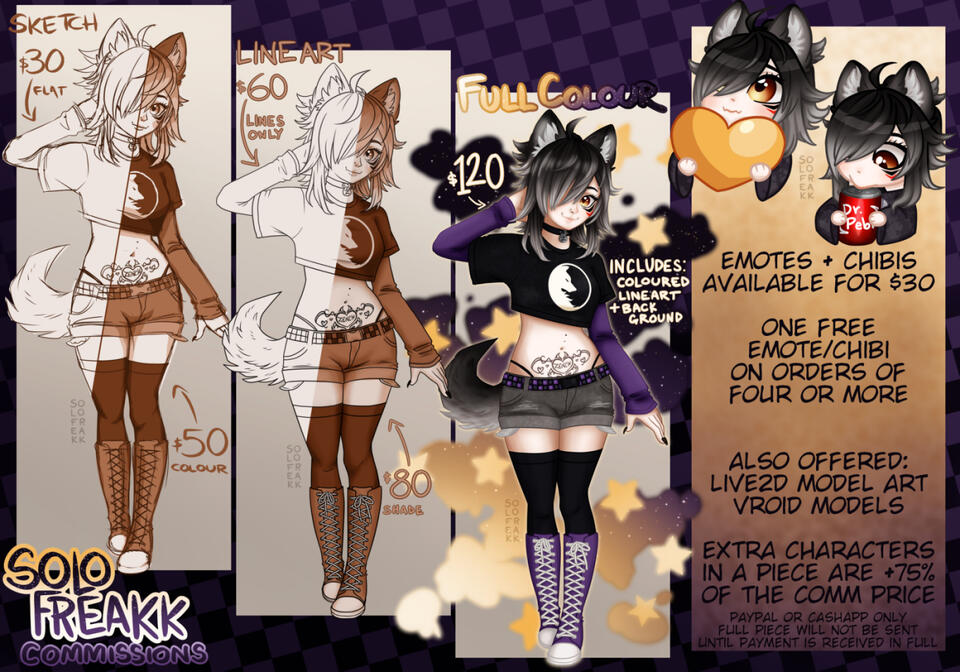 Vroid models vary based on complexity but start at $200.any extra characters in a commission are 75% of the base commission price.any emote or chibi orders in a large quantity (four or more) get one emote free!i don't normally do backgrounds beyond abstract shapes and such. if you have something in mind feel free to discuss it with me and we can work something out. i always send a version with and without the background.you can find more of my art by viewing my gallery.